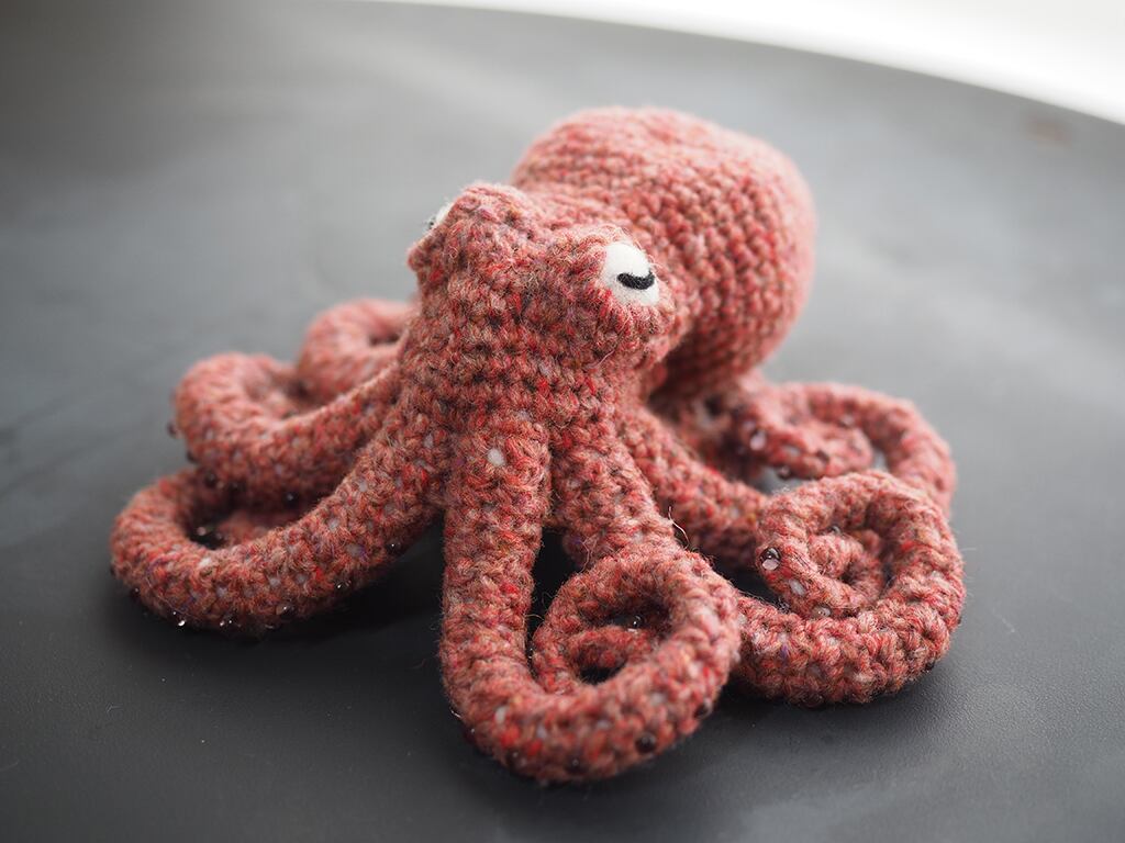 サーモンピンクに白やエンジが混ざったツイードの糸。頭と中綿の間に空間をつくって、本物のタコらしい感触を再現しました。頭の下には小さな漏斗も。