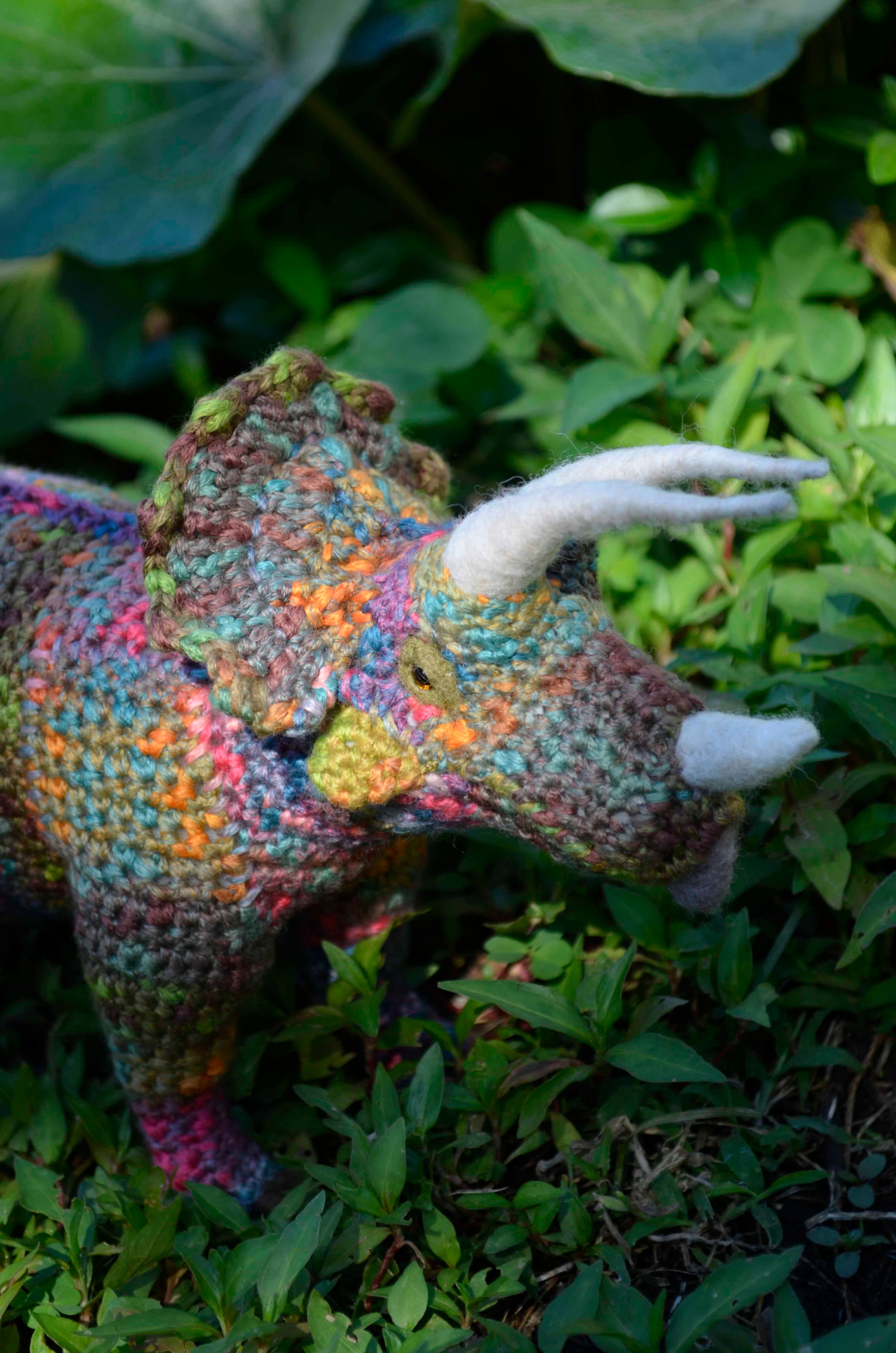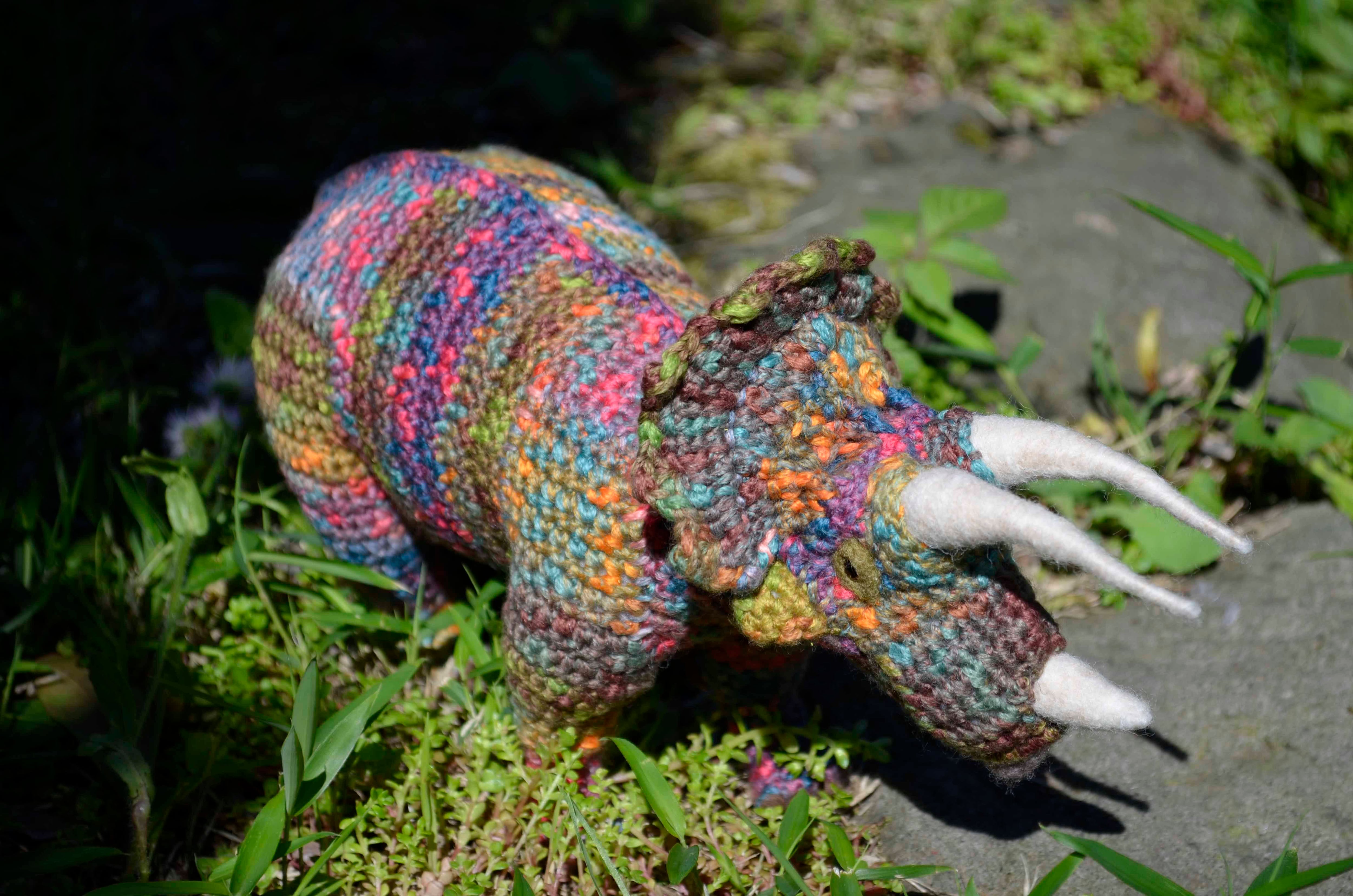 いろとりどりの段染めの糸で編んだトリケラトプス。