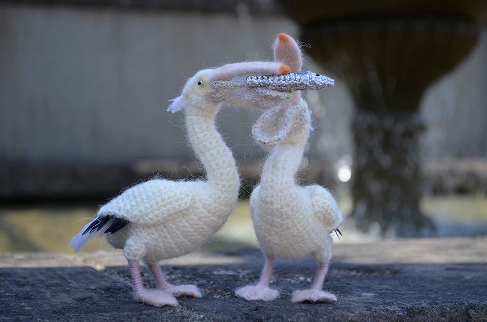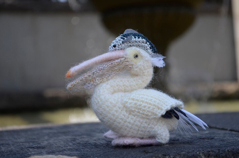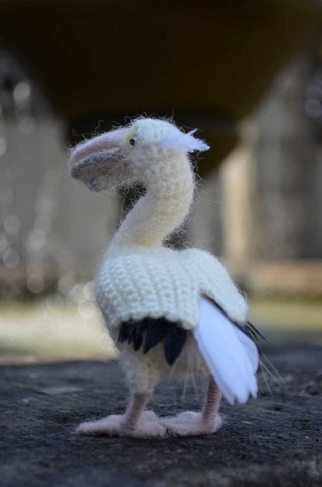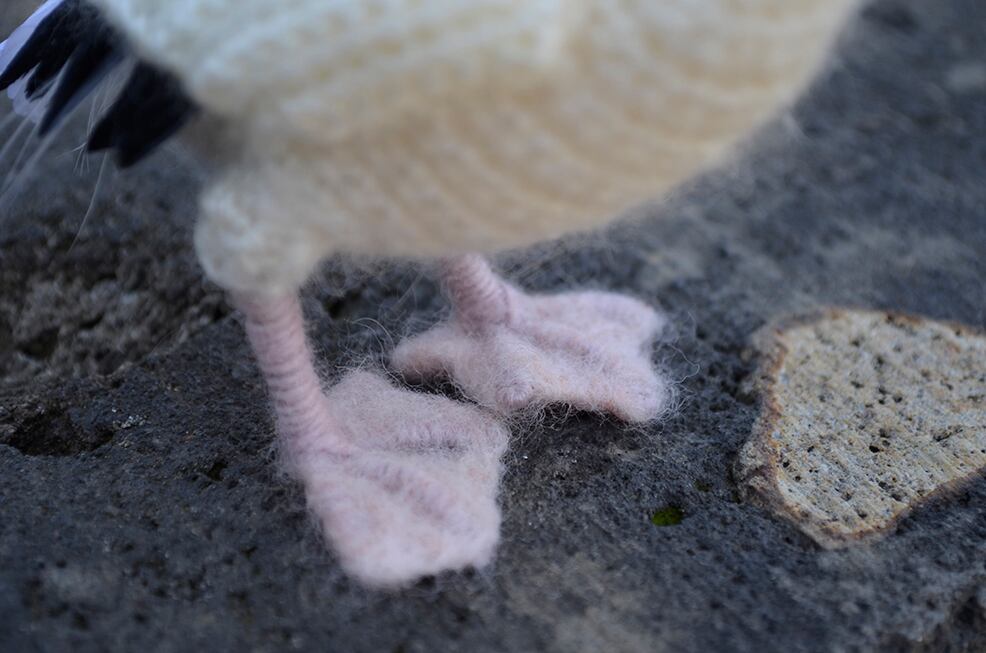 特徴的下クチバシの袋は細い糸で棒針編み、部分的に鳥の羽根を使ってリアルに仕上げました。水かきがついてペタペタ足音が聴こえてきそうです。