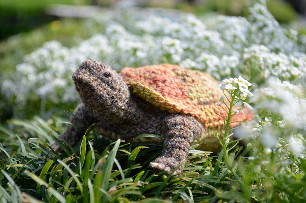 形はホルスフィールドリクガメを参考に、ほっこりした色合いの手染めの糸で作りました。